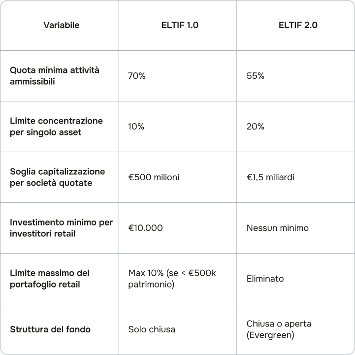 Tabella 1: Evoluzione dei requisiti ELTIF 1.0 vs ELTIF 2.0