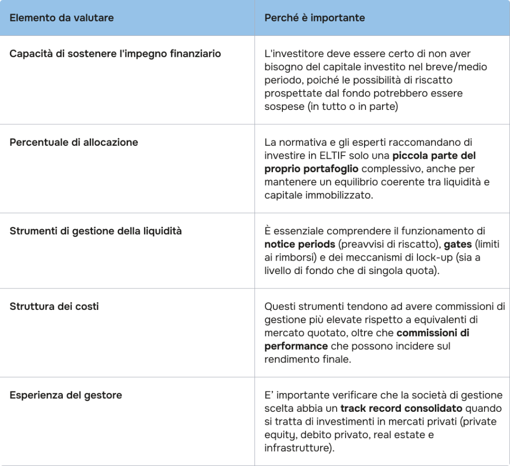 La normativa ELTIF impone per questo il superamento di un test di adeguatezza (suitability assessment). Il distributore deve verificare che il risparmiatore comprenda i rischi derivante dall’investimento in asset illiquidi e che sia in grado di sostenere un impegno finanziario di lungo periodo, implicando solitamente l’allocazione in ELTIF solo di una percentuale minore del proprio portafoglio complessivo.