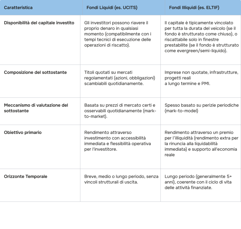 Per questa ragione, gli ELTIF sono definiti per legge come strumenti a “bassa liquidità”. Questa caratteristica li distingue nettamente dai fondi armonizzati tradizionali (UCITS), la cui filosofia si basa sul diritto dell’investitore di uscire in qualsiasi momento. Negli ELTIF, la stabilità del capitale è la condizione necessaria per investire nell’economia reale.